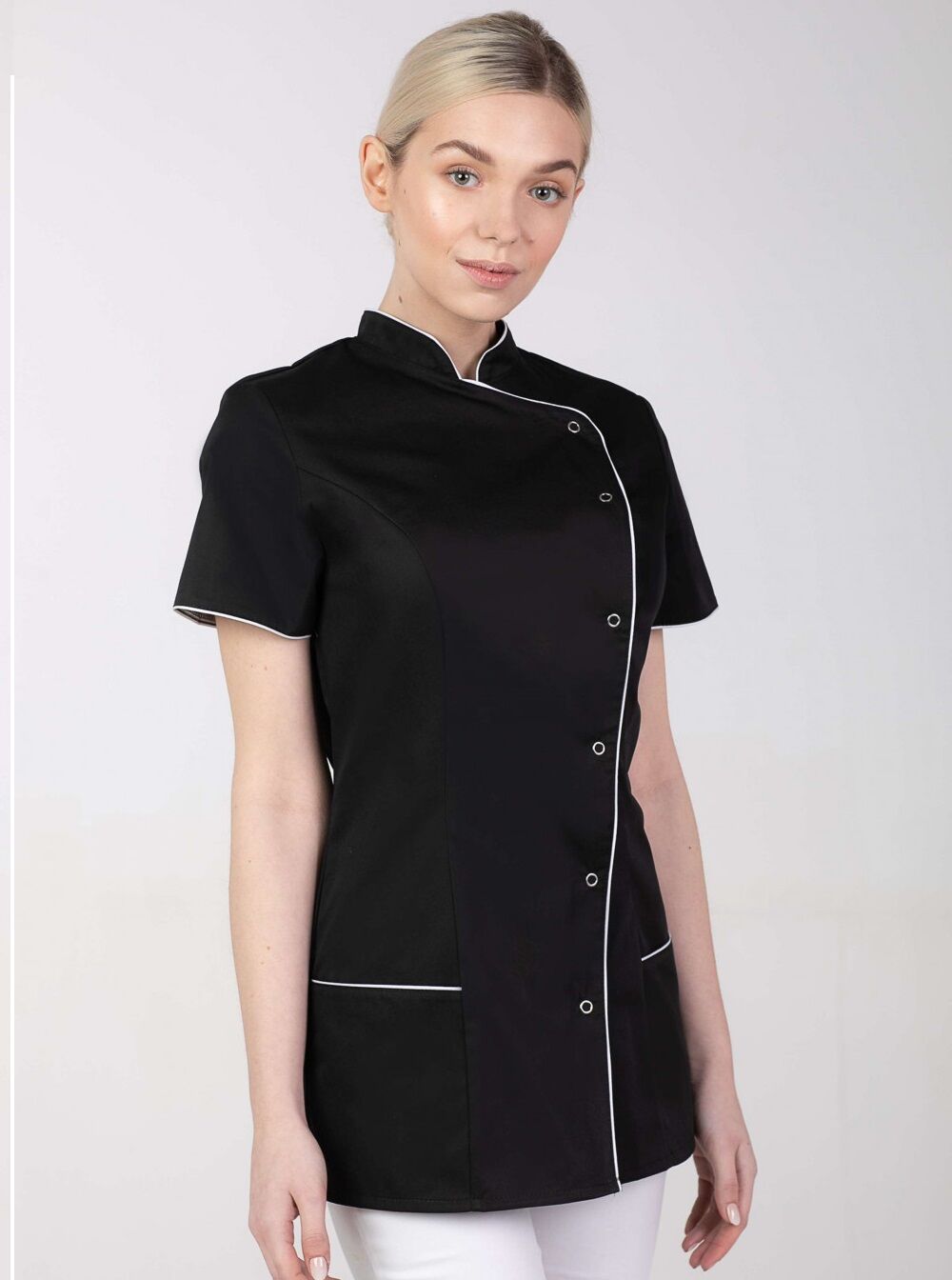 Elegancki i nowoczesny damski fartuszek kosmetyczny. Wygodny krój podkreślający kobiecą sylwetkę, zapinany asymetrycznie na praktyczne i bardzo trwałe napy. Żakiet posiada również dwie duże kieszenie boczne, bardzo przydatne podczas pracy. Wykończony bardzo elegancką stójką. Długość fartucha to 70 cm, idealnie pasuje do spodni lub spódnicy. Fartuch wykończony stylową lamówką.
