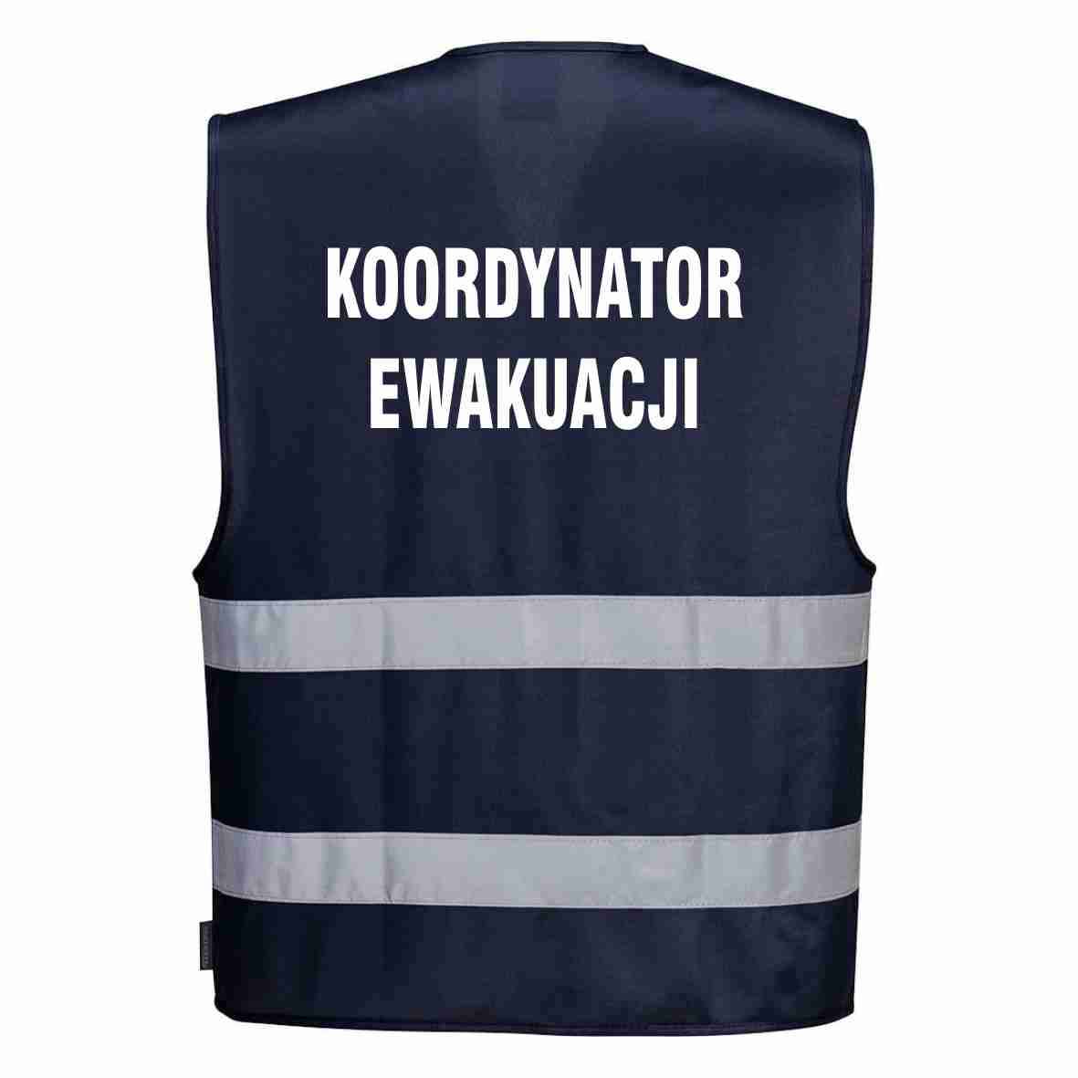 Kamizelka odblaskowa granatowa z nadrukiem KOORDYNATOR EWAKUACJI to doskonały wybór dla każdego, kto ceni sobie jakość, styl i funkcjonalność. Nie zwlekaj, zabezpiecz się przed niebezpieczeństwem!