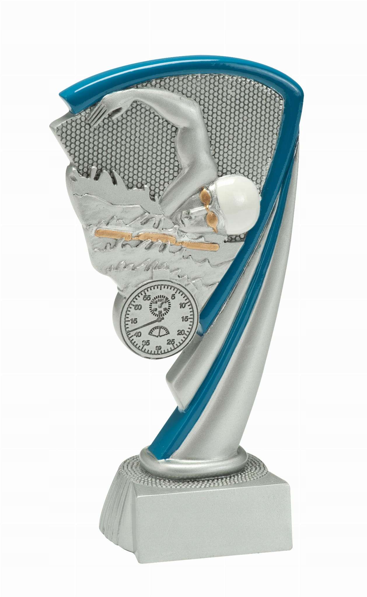 Srebrne trofeum z niebieskimi elementami przedstawiająca pływaka. Z pewnością może to być nagroda dla najlepszego pływaka podczas zawodów.
