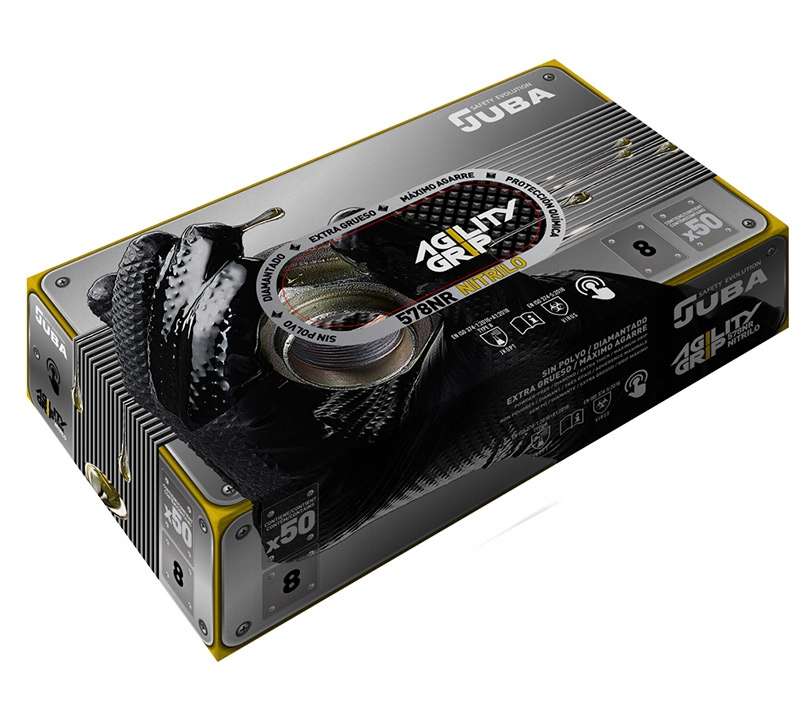 Specjalna struktura części chwytnej (znajdująca się obu stron rękawicy dzięki czemu nie ma różnicy na którą rękę zostanie założona) w postaci łuski zwiększa chwytność podczas pracy z przedmiotami i narzędziami które są wilgotne, zabrudzone smarem, olejem lub chemikaliami.